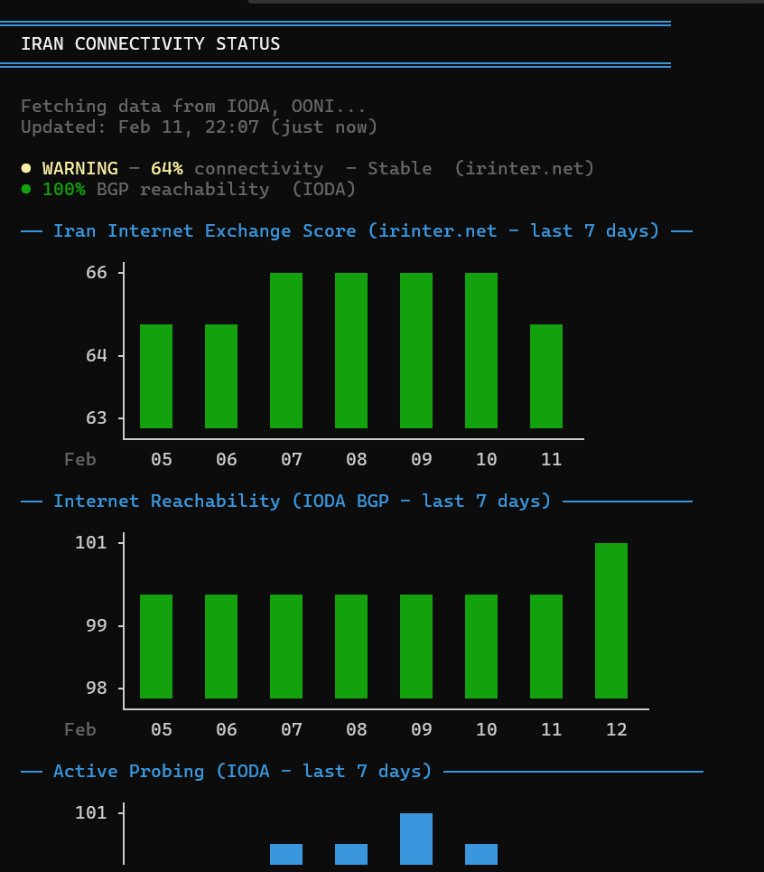 - Iran Connectivity Status: real-time monitoring with IODA, OONI, irinter.net, and Cloudflare Radar data with 7-day charts - Iran Connectivity Test: diagnostics across 88 servers in 24 cities with quick test, full report, stability test, and MTU discovery - Psiphon Network Stats: global analytics with daily users, bytes transferred, running proxies, and country distribution charts - CLI Commands Reference page and reorganized Info & Help menu - Updated license and screenshots